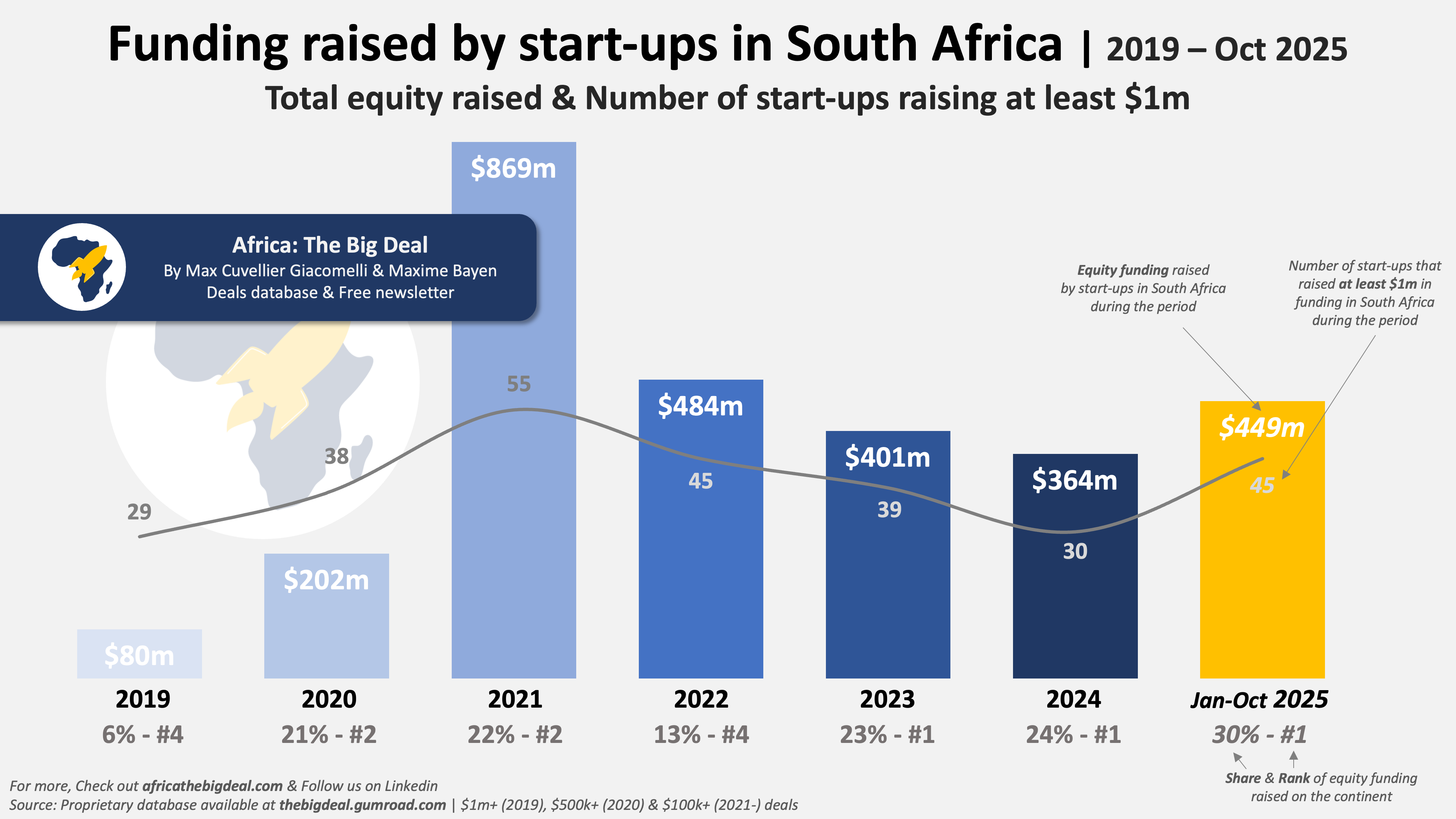 As one of the so-called Big Four, South Africa has consistently been one of the top four markets in terms of start-up funding raised on the continent since we started tracking the numbers back in 2019. From $80m in 2019 (all types of funding included, except exits), it went up to $869m in 2021 at the top of the funding heatwave, and has been hovering around the $400m/year mark since then. As of the end of October, start-ups in South Africa have raised $484m in 2025 so far. In terms of ranking, the country peaked at #2 in 2021, but has otherwise been holding either the #3 or #4 spot. Yes, that’s right, it somehow never held the top spot. And this is the part that felt a bit off, considering how mature the ecosystem feels on the ground, and the number of announcements coming out of the market…