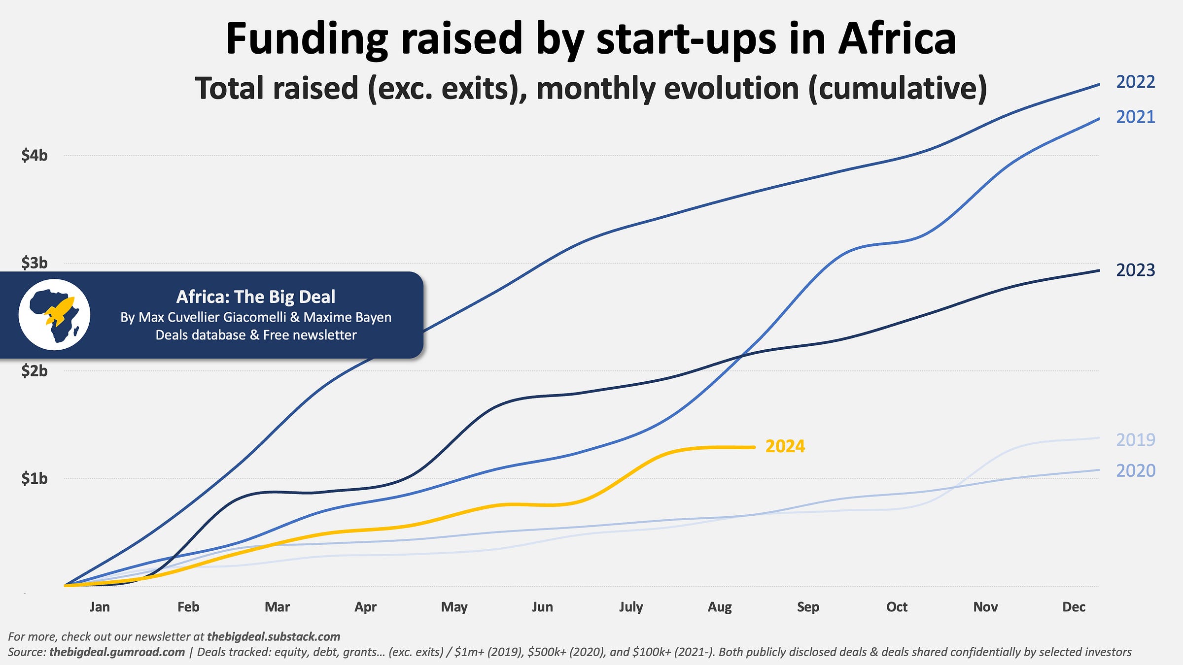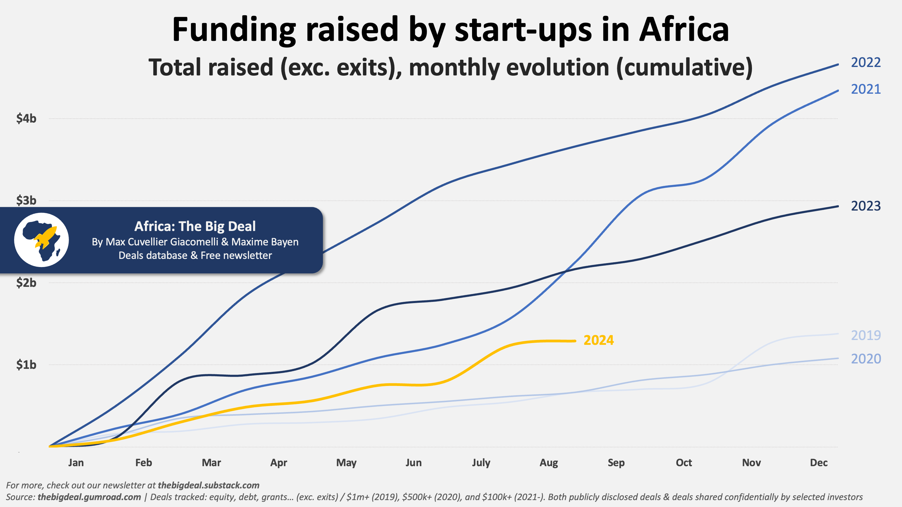 When we covered the really good performance of the ecosystem in July last month, we knew there was a risk that it might not keep up in August. And in fact, things have been much slower last month: start-ups in Africa announced only $56m in funding, down from $443m in July (~8x less) and $234m in August 2023 (~4x less), making August 2024 the second-slowest month in four years in terms of funding raised, after June 2024 ($42m). The majority of this funding was raised as equity (87%); the rest was debt (9%) and grants (4%).