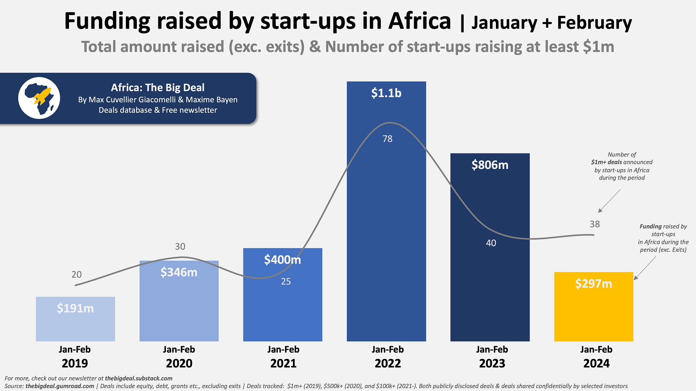 Funding for Jan+Feb 2024 is lower than what it had been at the same time of the year in the past four years, despite a decent number of start-ups (38) raising $1m+ during the period. What could it mean for 2024 as a whole? It’s obviously too early to tell, but here’s some maths, for what it’s worth: in an optimistic scenario (à la 2021 when Jan+Feb ended up representing only 9% of the total raised throughout the year), start-ups in Africa could be raising $3.2b this year; in an ‘average’ scenario (overall between 2019 and 2023, Jan+Feb represented 21% of the total total on average), we’d be looking at only $1.4b; we’d rather not discuss a pessimistic scenario. And as we know, the total is also very much dependent on mega deals, which may well already be in the works…