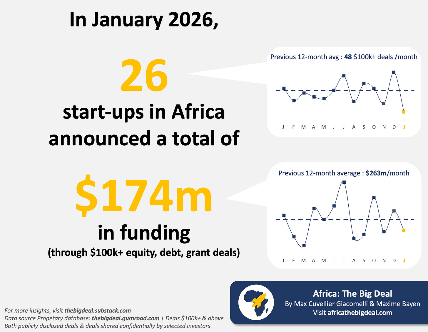 Now, start-ups in Africa have raised a total of $174m in funding in January 2026 through $100k+ deals (equity, debt, grants; exc. exits). This is significantly lower than what was raised in January 2025 ($276m) and also well below the monthly average over the previous 12 months ($263m). It is much higher though than January 2023 ($106m) and 2024 ($85m). What is more concerning however is the fact that only 26 start-ups announced at least $100k in funding in January. That is very low: just above half of the monthly average over the previous 12 months, and of January 2025. As a matter of fact, on this specific metric, this is the lowest monthly tally on record since at least 2020…