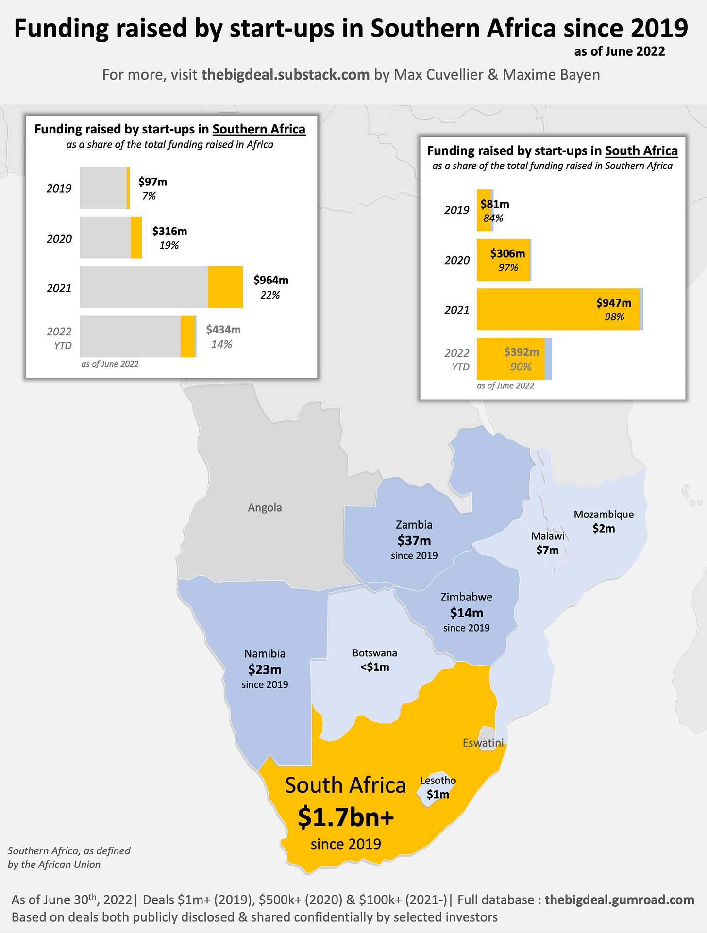 Following our coverage of Eastern, Northern and Western Africa - and after a quick break to celebrate H1 results ($3bn+ 🥳) - we’re off to Southern Africa this week. Southern Africa represents 17% of all the funding raised by start-ups in Africa since 2019, which puts it in third position behind its Western and Eastern cousins. This share is slightly lower this year so far (14%) than in 2021 (22%) and 2020 (19%), but with 6 months to go until the end of 2022, it is just too early to say whether this is a trend or not. Now, when we’re talking about Southern Africa, we’re really talking about South Africa: with $1.7bn+ raised since 2019, it represents over 95% of the funding raised by start-ups in the region. In the past three years, funding raised by start-ups in South Africa has displayed strong and steady growth: x3.7 between 2019 and 2020, and x3.1 between 2020 and 2021. In the first half of 2022 so far, the numbers pretty much match those of last year ($394m in H1 2021; $392m in H1 2022; -1% YoY). No other market can really compete with South Africa at this stage. Indeed, the second country in terms of funding is Zambia though with 46x times less funding raised ($37m) through 22x times less $100k+ deals (12 vs. 263+). Namibia and Zimbabwe come next, but no other market than Zambia can claim more than ten $100k+ deals since 2019. All in all, as we’ve seen with other regions, it is tough to grow in a giant’s shadow… but it’s even tougher in Southern Africa.