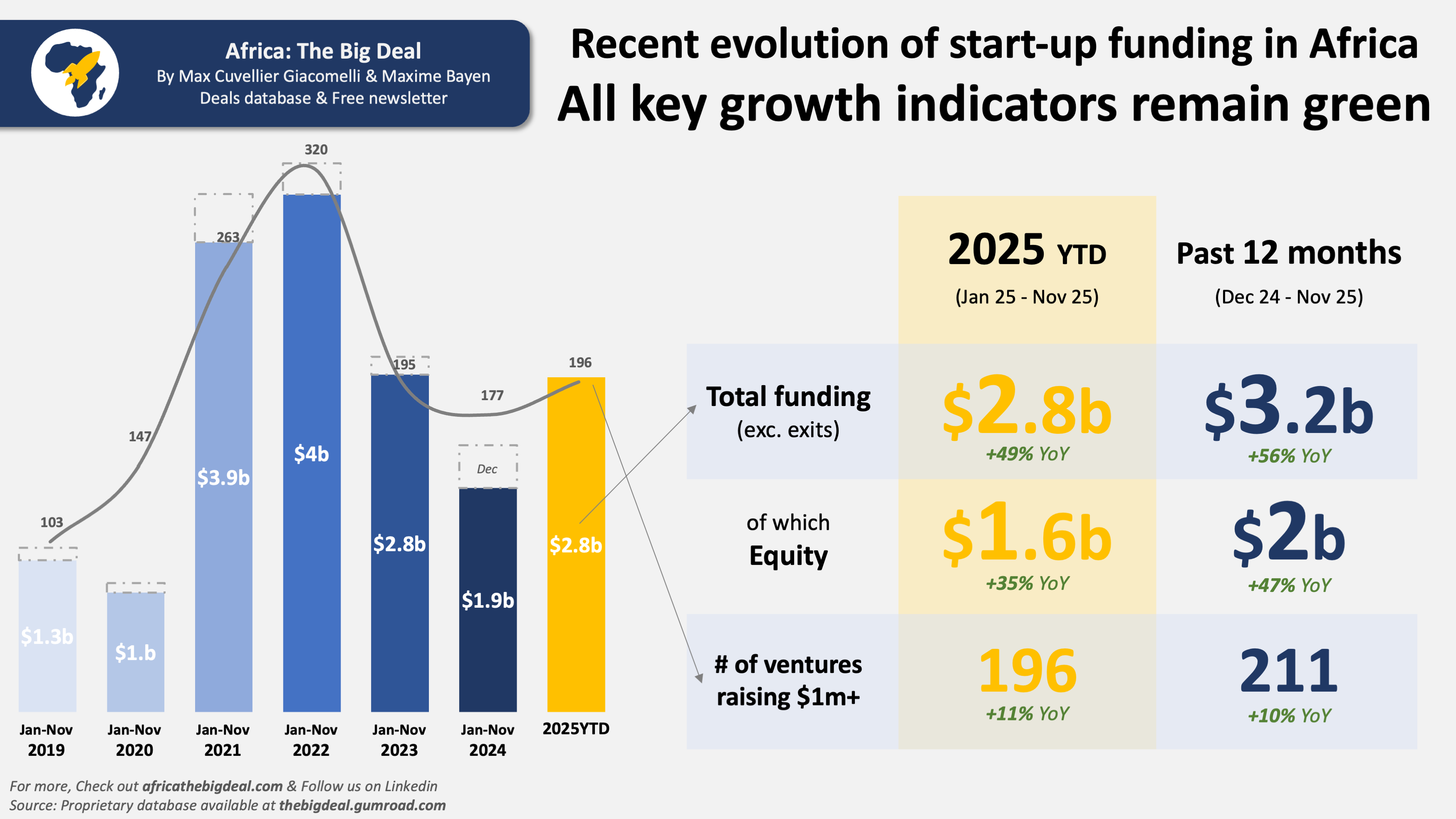 Now we’ve entered the final final stretch of 2025, the numbers continue to look very good overall: so far $2.8b have been raised by start-ups on the continent (exc. exits), nearly 50% more than at the same time last year. The amount raised in equity and the number of ventures raising $1m or more are also on the up. We’ve established since the beginning of October that start-up in Africa have already raised more in 2025 than in 2024. The question now is whether they can also top the 2023 numbers. If we compare Jan-Nov 2025 to Jan-Nov 2023, the numbers are shockingly similar: $2.81b (inc. $1.64 in equity) and 196 start-ups raising at least $1m in 2025 so far vs. $2.84b (inc. $1.62 in equity) and 195 start-ups raising at least $1m in Jan-Nov 2023. Now for 2025 to beat 2023, start-ups need to raise at least $172m in December, which seems achievable as the monthly average in 2025 so far has been around $250m, and start-ups have always raised more than $172m in December since 2021… except in 2023…