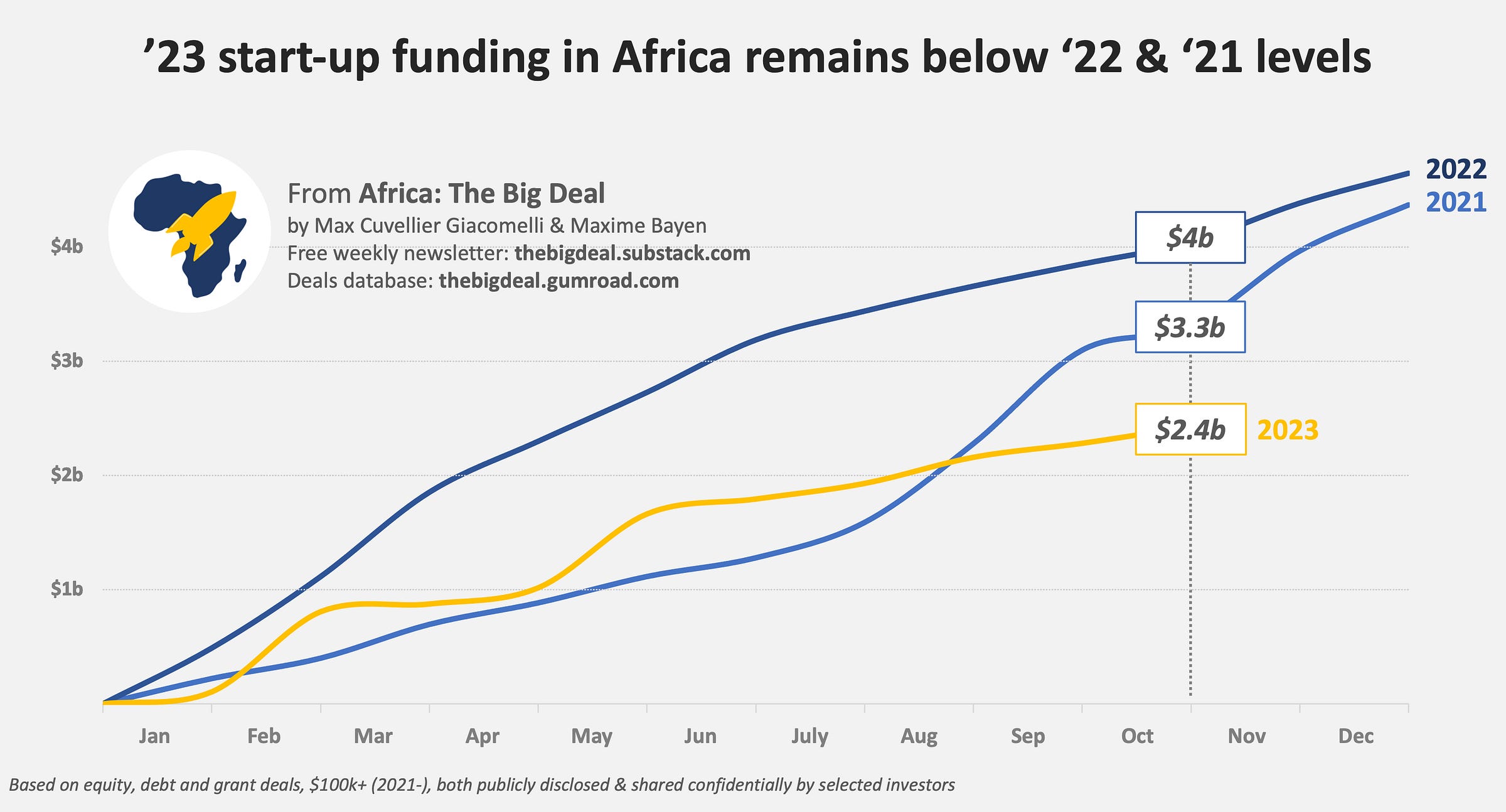 As you may remember, September fundraising levels in Africa were particularly low. The moderately good news is that they bounced back a little bit in October. If we’re looking at equity only, start-ups on the continent raised $69m last month, a 12% MoM increase compared to September ($61m). If we add debt - and a couple grants -, the total reaches $148m (+20% MoM). That said, these numbers remain much below last year’s numbers: -23% YoY ($148m vs. $193m) if we’re looking at all types of funding, and a quite dramatic -60% YoY (i.e. ÷2.5) if we look at equity only ($69m vs. $169m). As a comparison, on average in 2021-2022 start-ups in Africa were raising $330m a month in equity funding ($376m including debt and grants). That said, October 2023 numbers compare more favourably to pre-’funding heatwave’ numbers: in October 2020 start-ups in Africa had raised only $71m (inc. $39m equity).